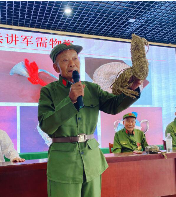 三位老兵厚意敘述了三位自己參軍歲月的感人故事,同學們都被三位老戰士當年不怕犧牲、兢兢業業、無私奉獻的精力深深感動。學生代表用昂揚緬懷的言語、火熱的愛國情感為全校同學敘述了發生在大豐大地上一個個難忘的革新故事。老兵們用質樸的言語為同學們講解了幾種軍需物資的作用,了解當年的軍旅生活。全校師生在老兵的帶領下一同唱起國歌,響亮的歌聲,激蕩著每個人心中的愛國之魂。